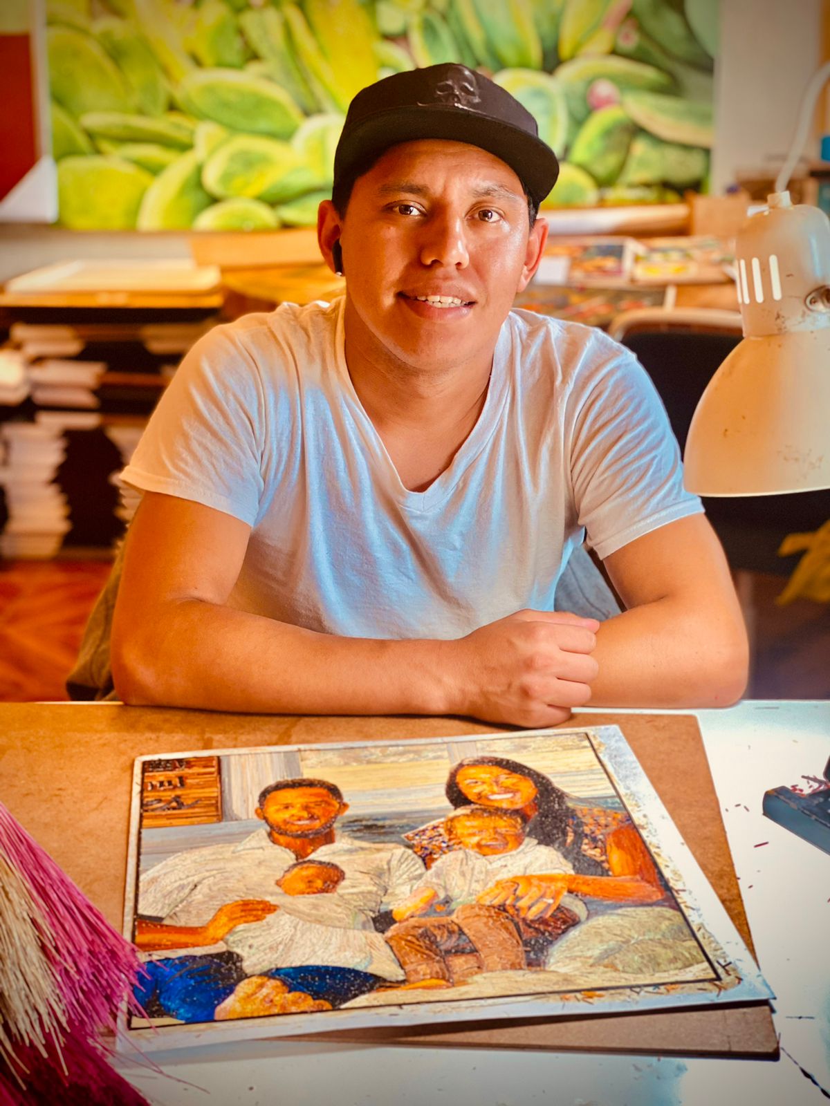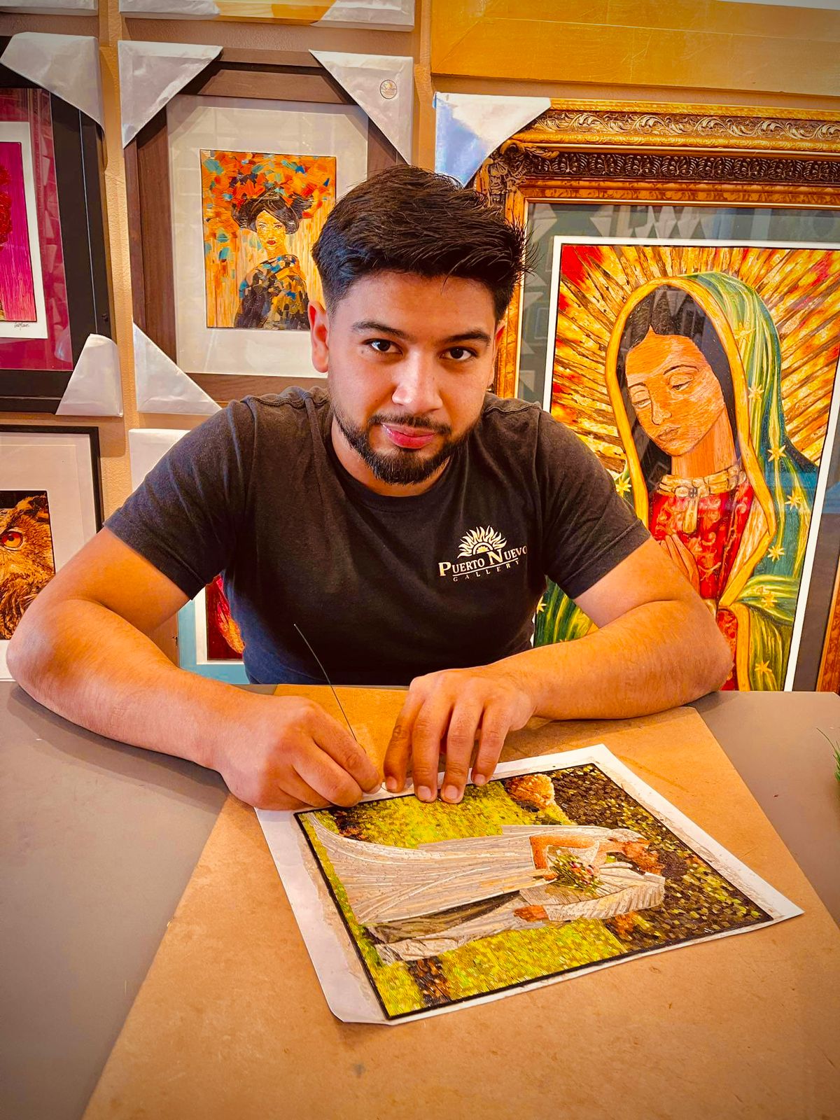 Originario de Acapulco, Guerrero, inició su carrera artística en 2016 en la Galería de Puerto Nuevo. Especializado en la técnica de popotillo, se destaca como un experimentado exponente en la realización de proyectos especiales.